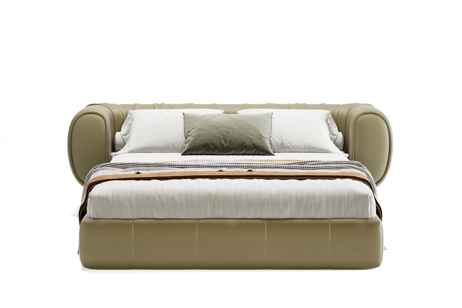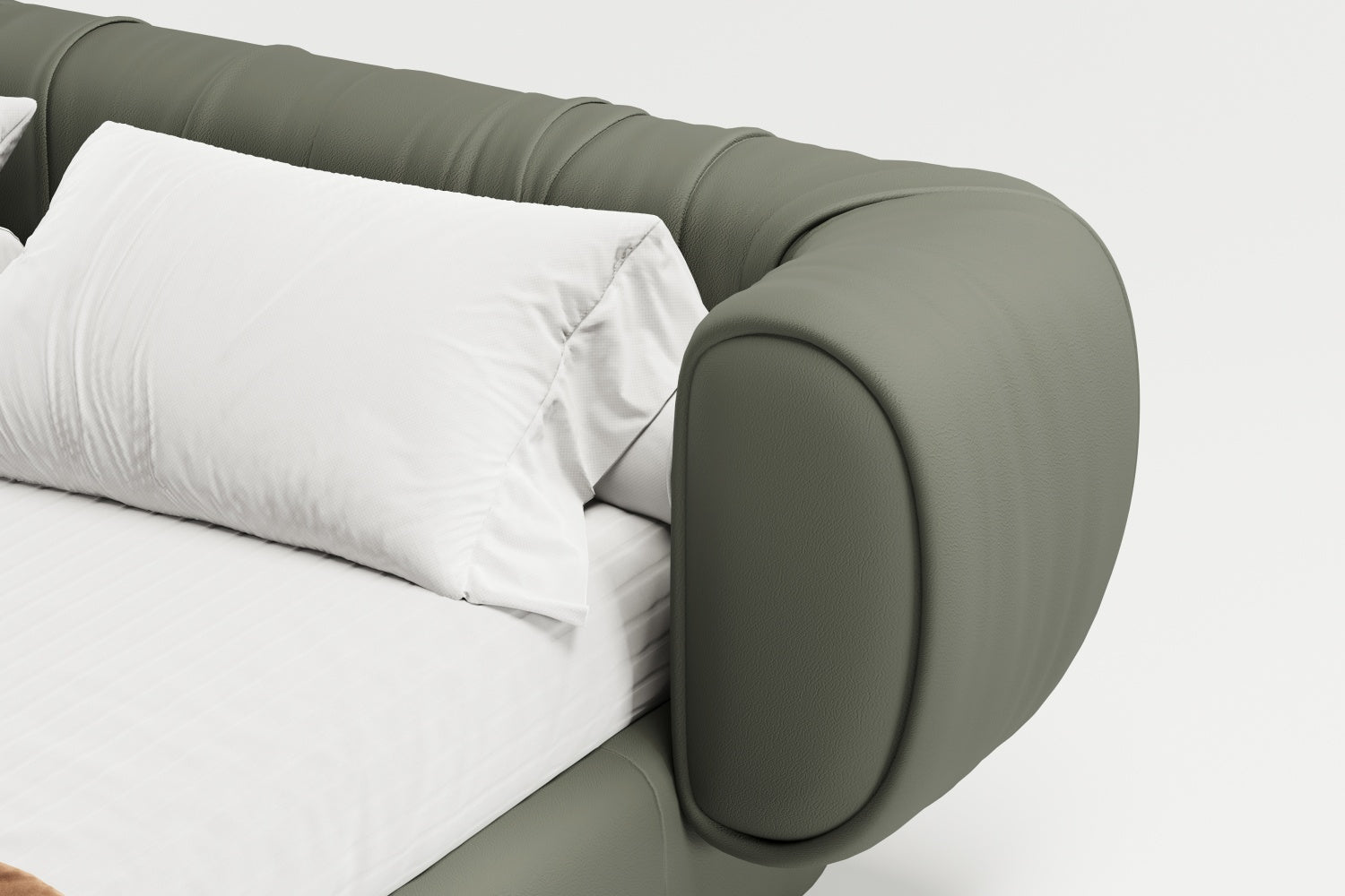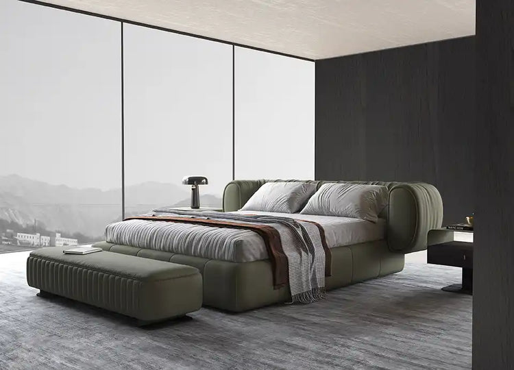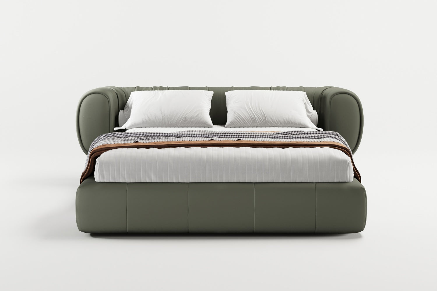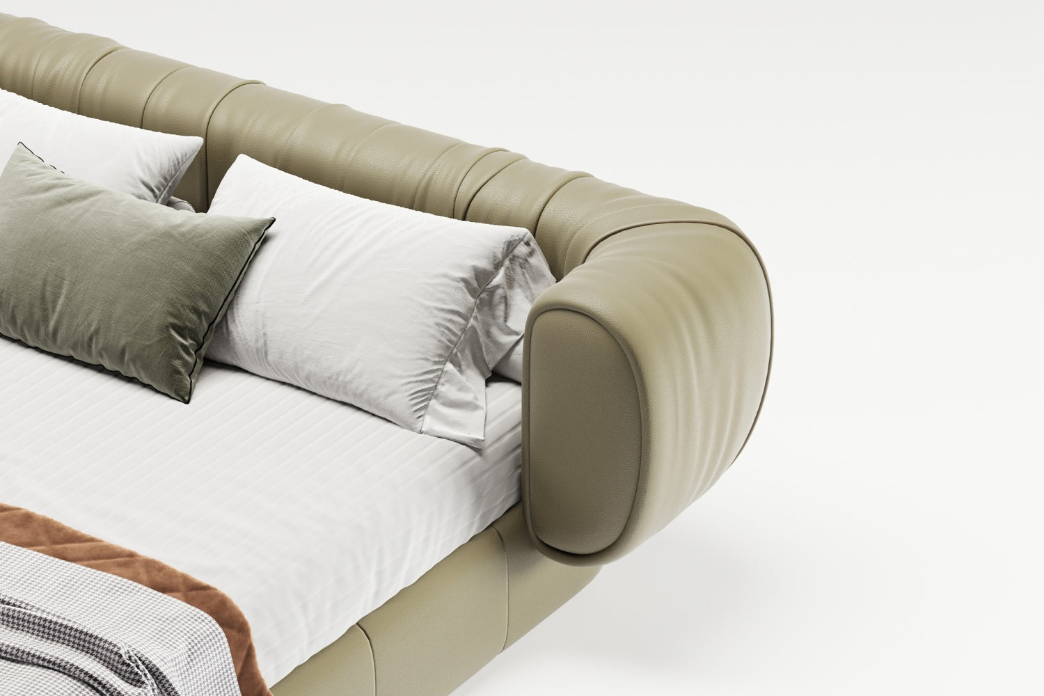 Supple genuine leather wraps the frame like a tailored garment, while solid wood beneath provides unspoken strength and heritage. Every curve is deliberate, every surface an invitation. The bed appears substantial yet soft, expressive yet controlled — a piece that anchors the room without overwhelming it.