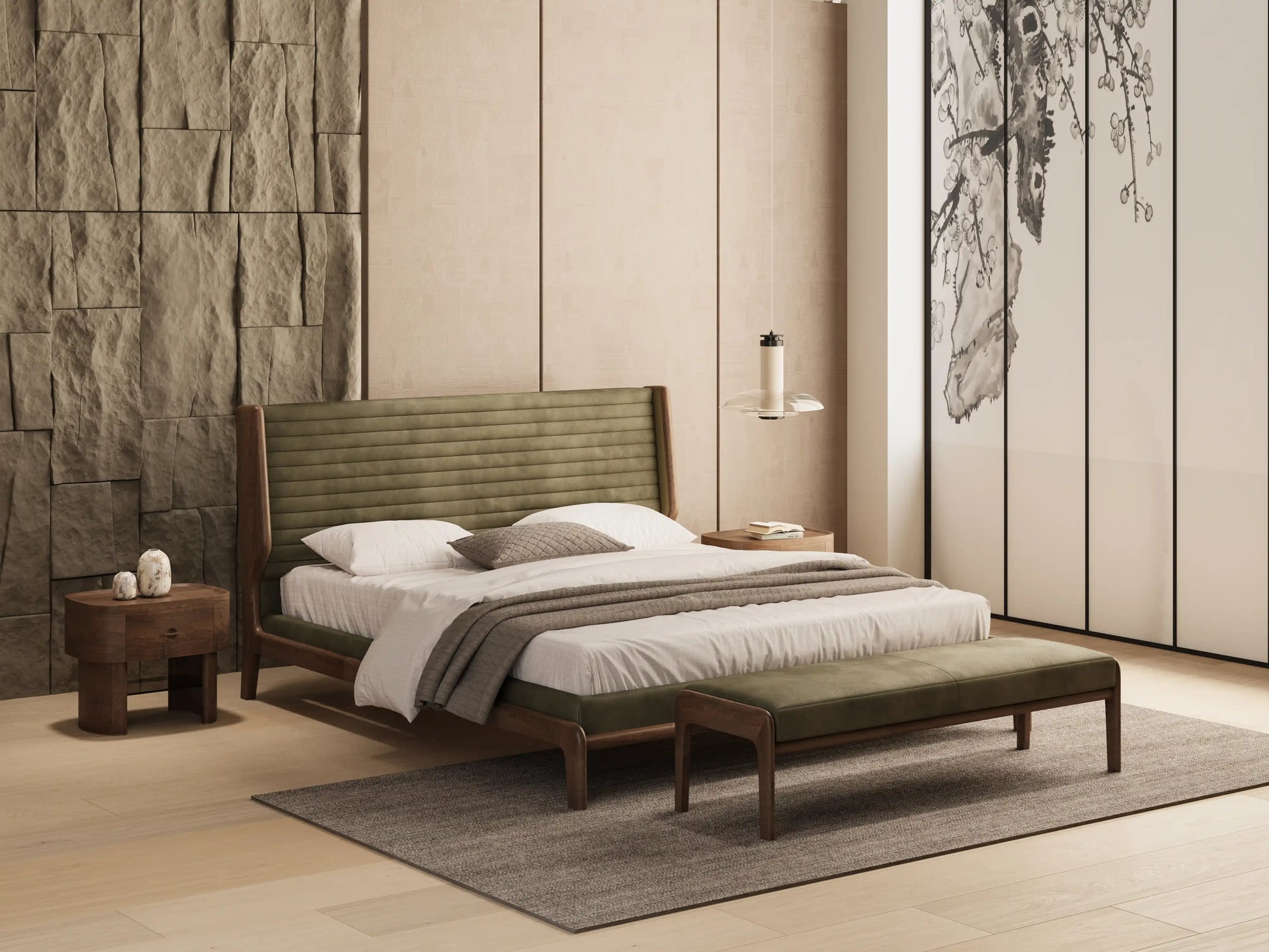 Neither ornamental nor austere, HE LE speaks in balance: between texture and geometry, tradition and modernity, function and beauty. It is not simply placed beside a bed—it completes the atmosphere of the room with quiet authority.
