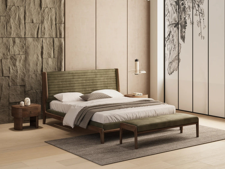 The natural grain reveals itself like fine calligraphy upon wood, each line distinct, each surface carefully finished to express warmth beneath its reserved strength. Designed to accompany the most intimate moments of rest, it holds books, light, and personal treasures as though it were curated space itself.