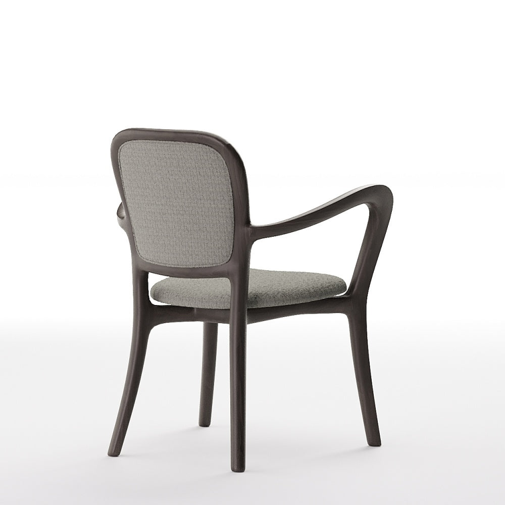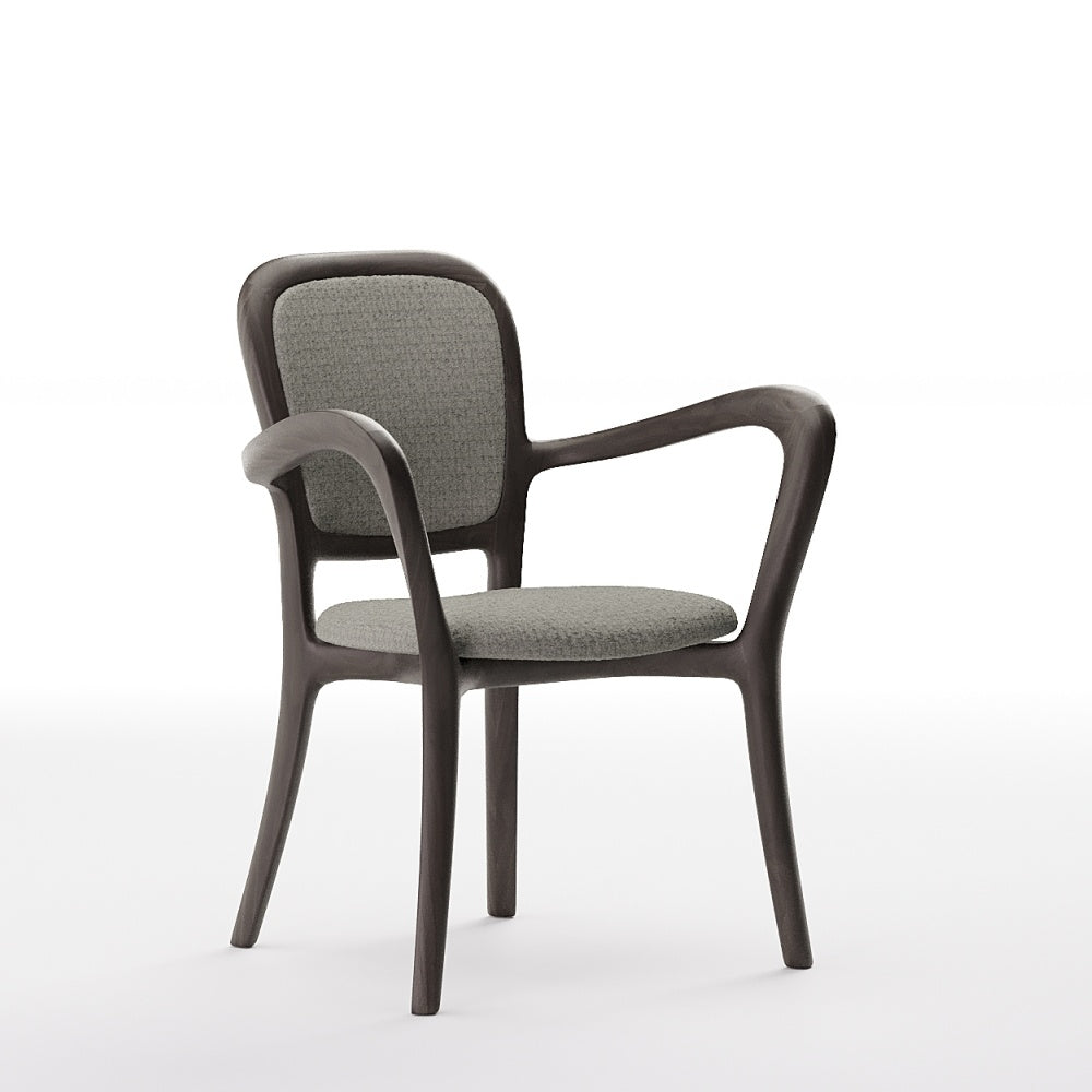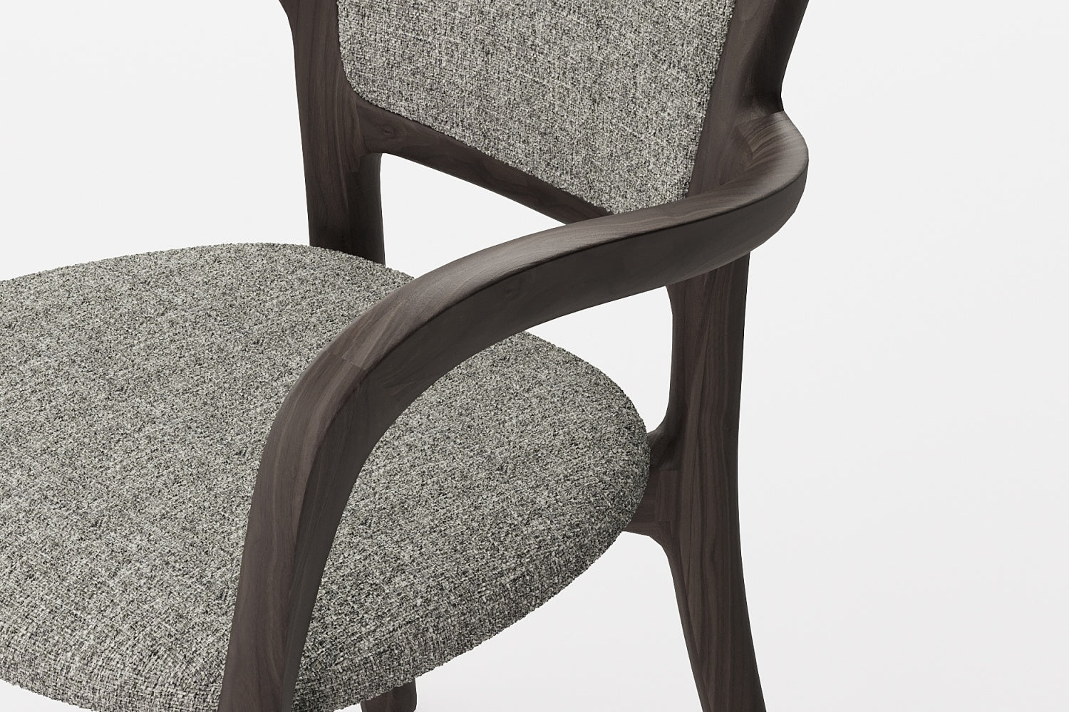 The silhouette flows with a gentle discipline — curved yet composed, warm yet architectural. The walnut frame reveals a depth of tone that matures with time, while the upholstered surfaces invite touch with a subtle promise of comfort. This is a chair not designed to command attention, but to sustain it — through balance, proportion, and presence.