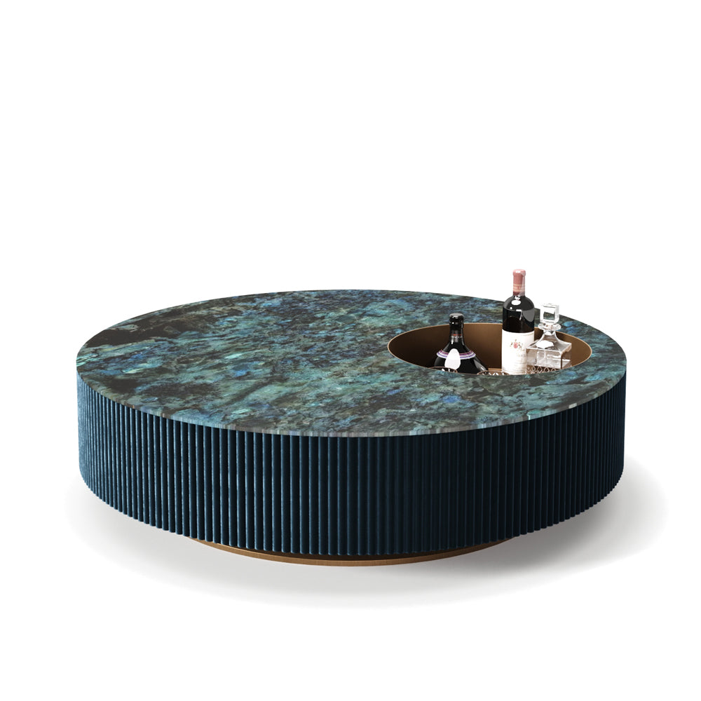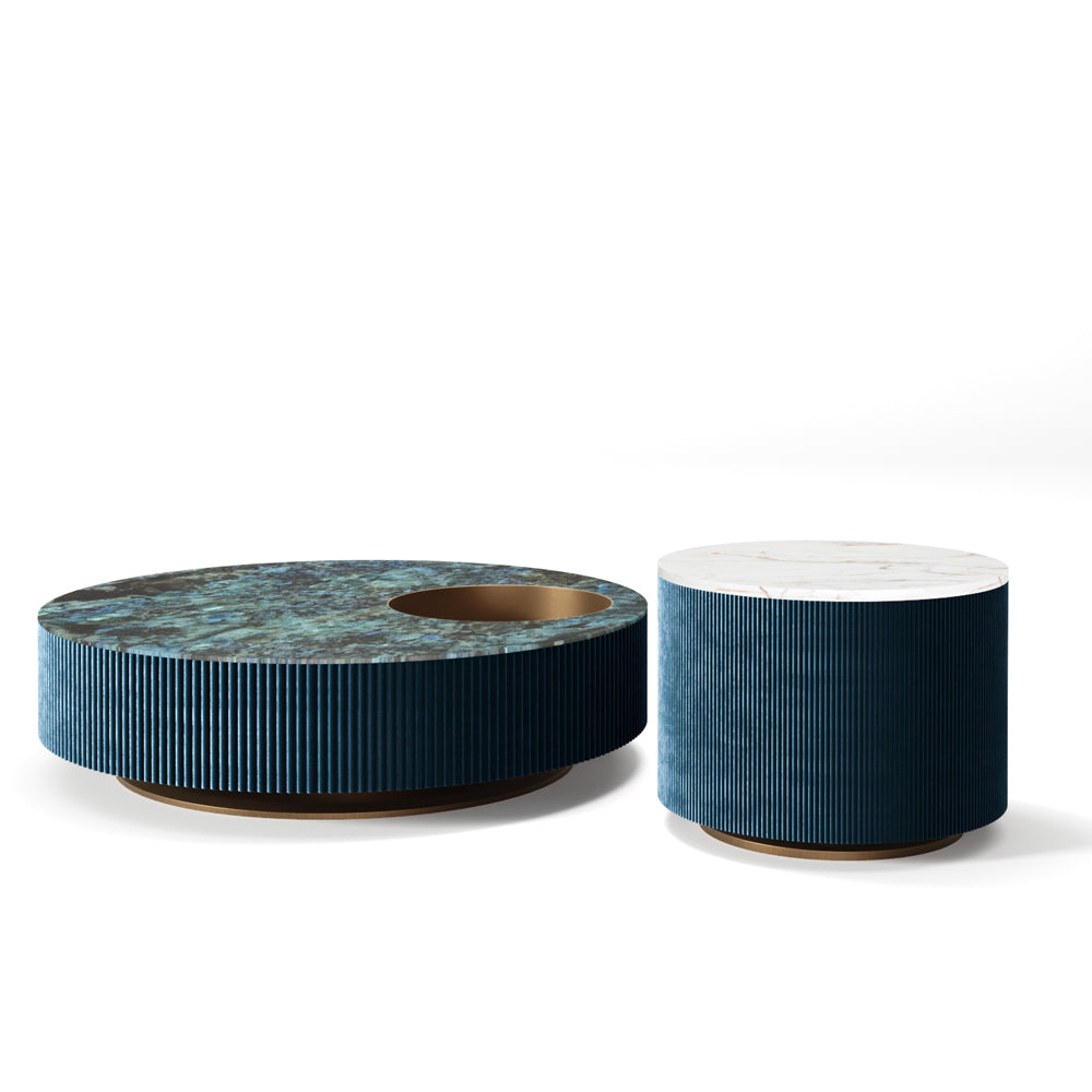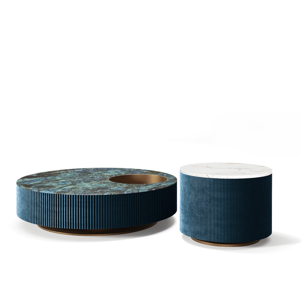 This coffee table, part of the HESTIA’S ODE SERIES, is a celebration of the timeless elegance that defines classic European interiors. Its refined silhouette balances artistry and functionality, with a lacquered blue wood base that exudes depth and texture. The striking Norwegian Jade marble top offers a rich, mesmerizing pattern that feels both luxurious and organic, evoking the aura of a grand, storied home. Subtle matte brass accents add an air of quiet sophistication, their soft sheen punctuating the table’s minimalist design.