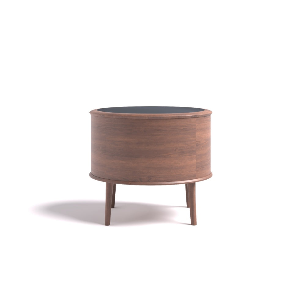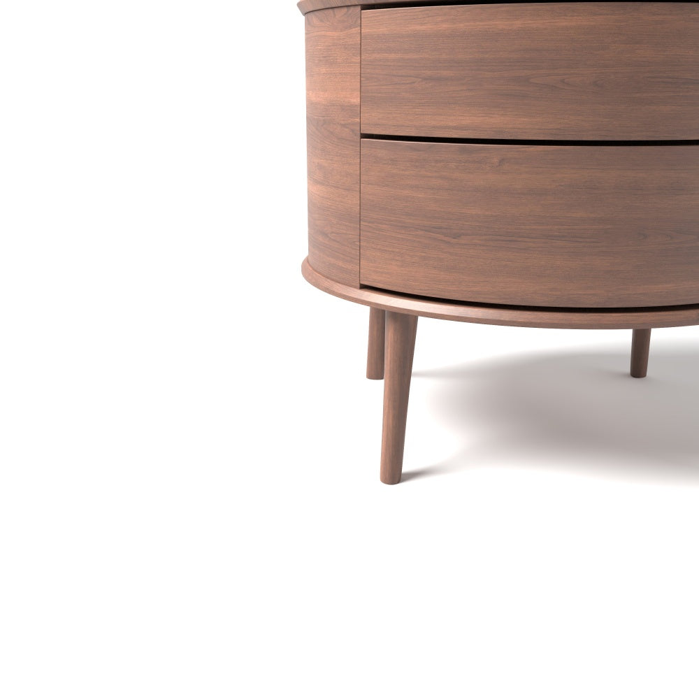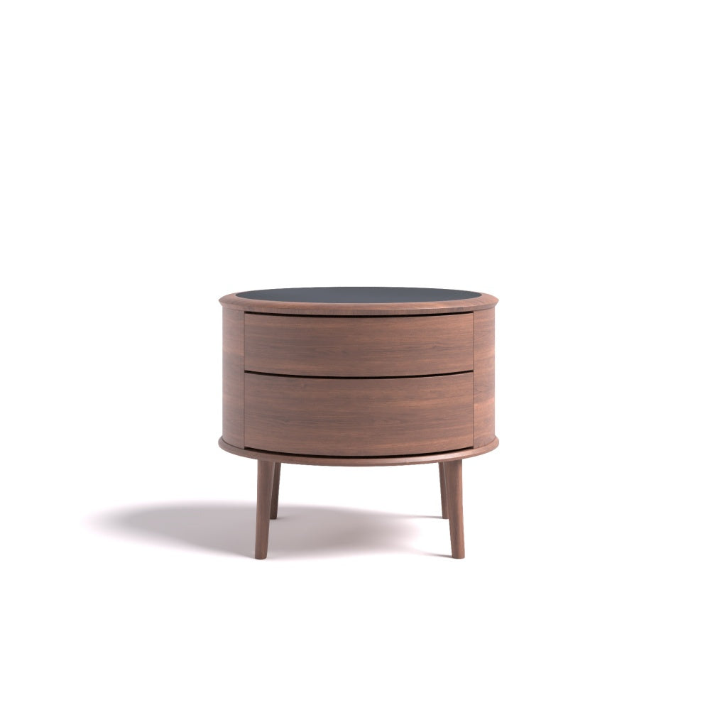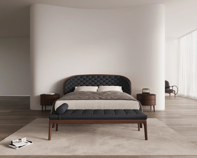 The RU DIAN Bedside Table is composed as a nocturne for the modern bedroom — where North American black walnut meets supple full leather in a dialogue of warmth and restraint. Rounded contours recall the calm curve of ancient vessels, while the layered silhouette carries a quiet sense of ceremony into everyday life.