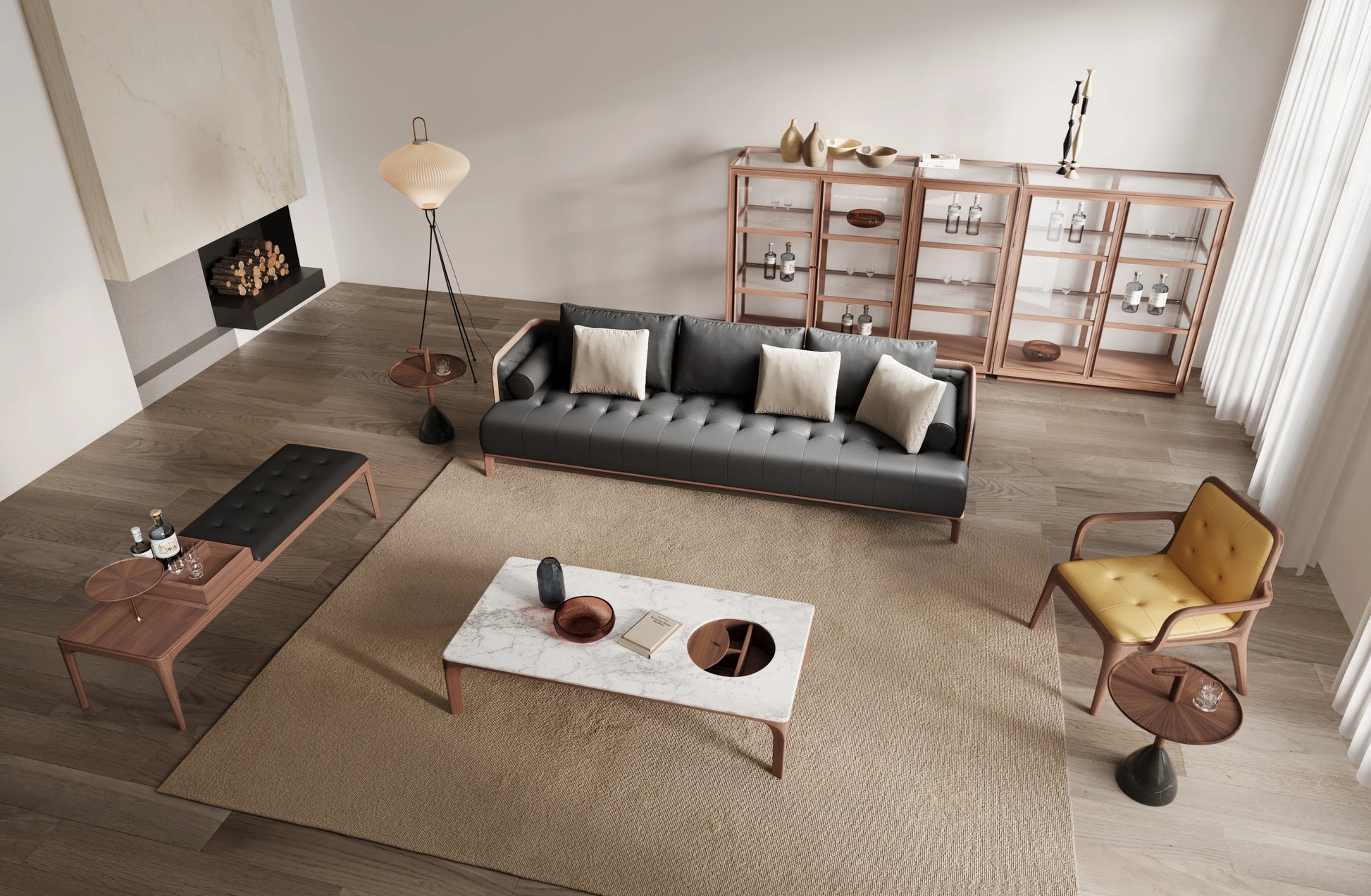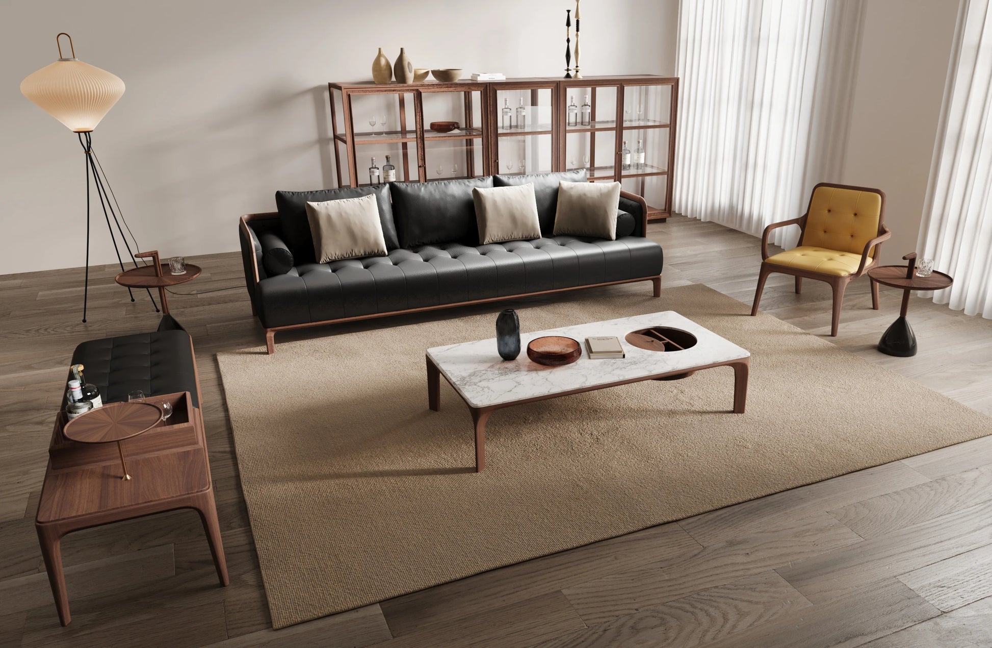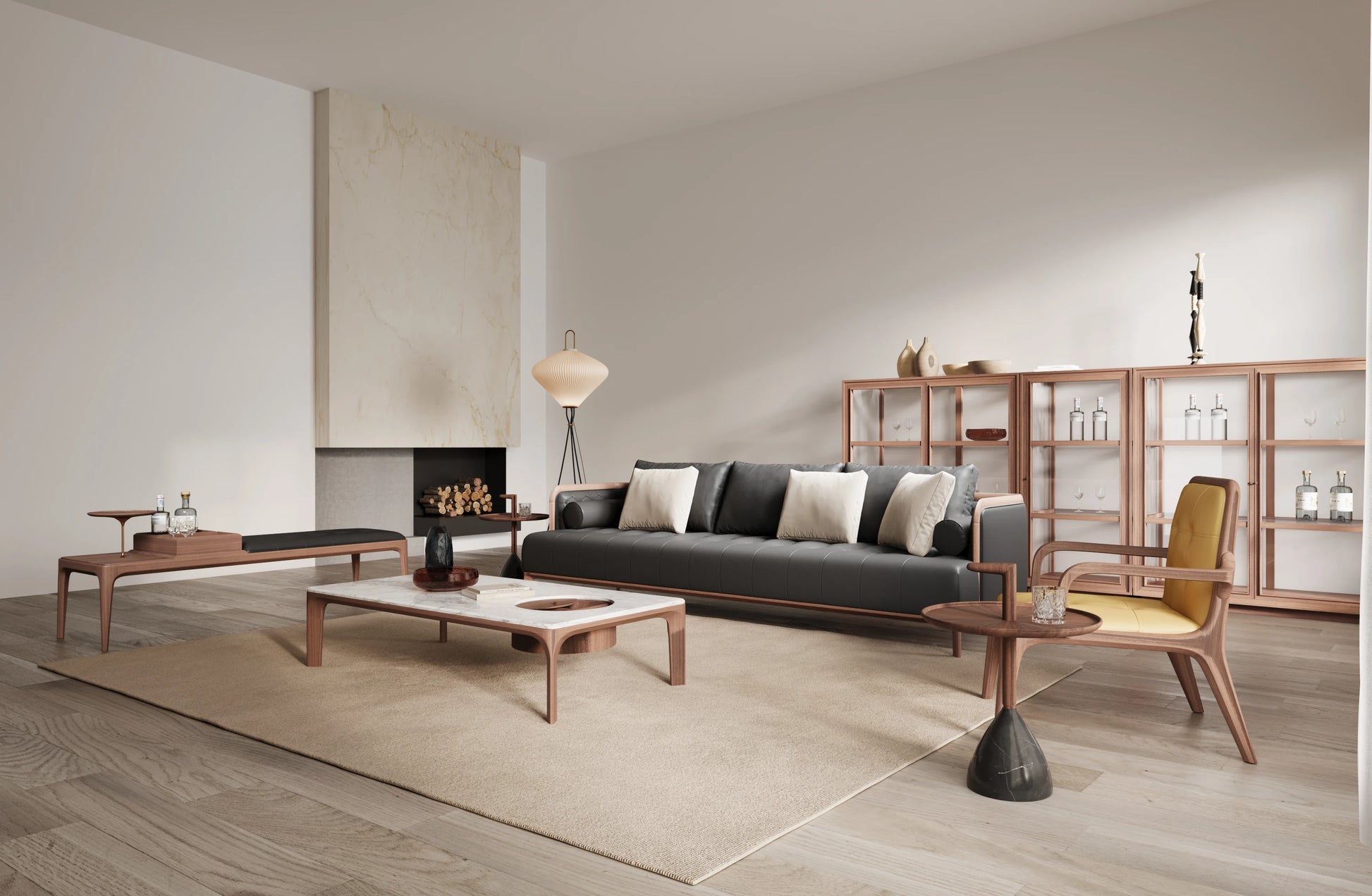 The sofa reveals itself through proportion rather than ornament, through balance rather than excess. Its low, grounded profile creates a sense of composure, while generous seating invites the body into a posture of ease that feels instinctive, almost ceremonial.