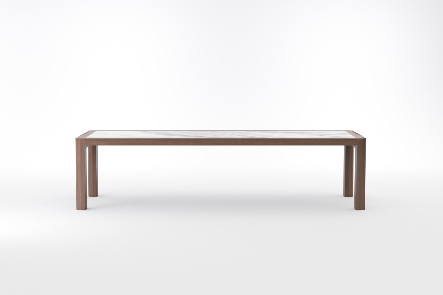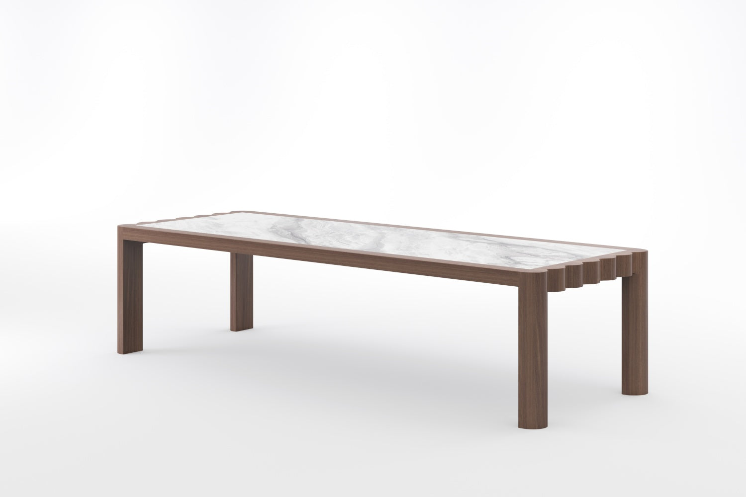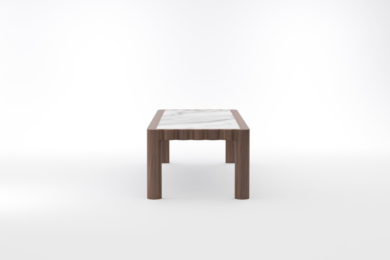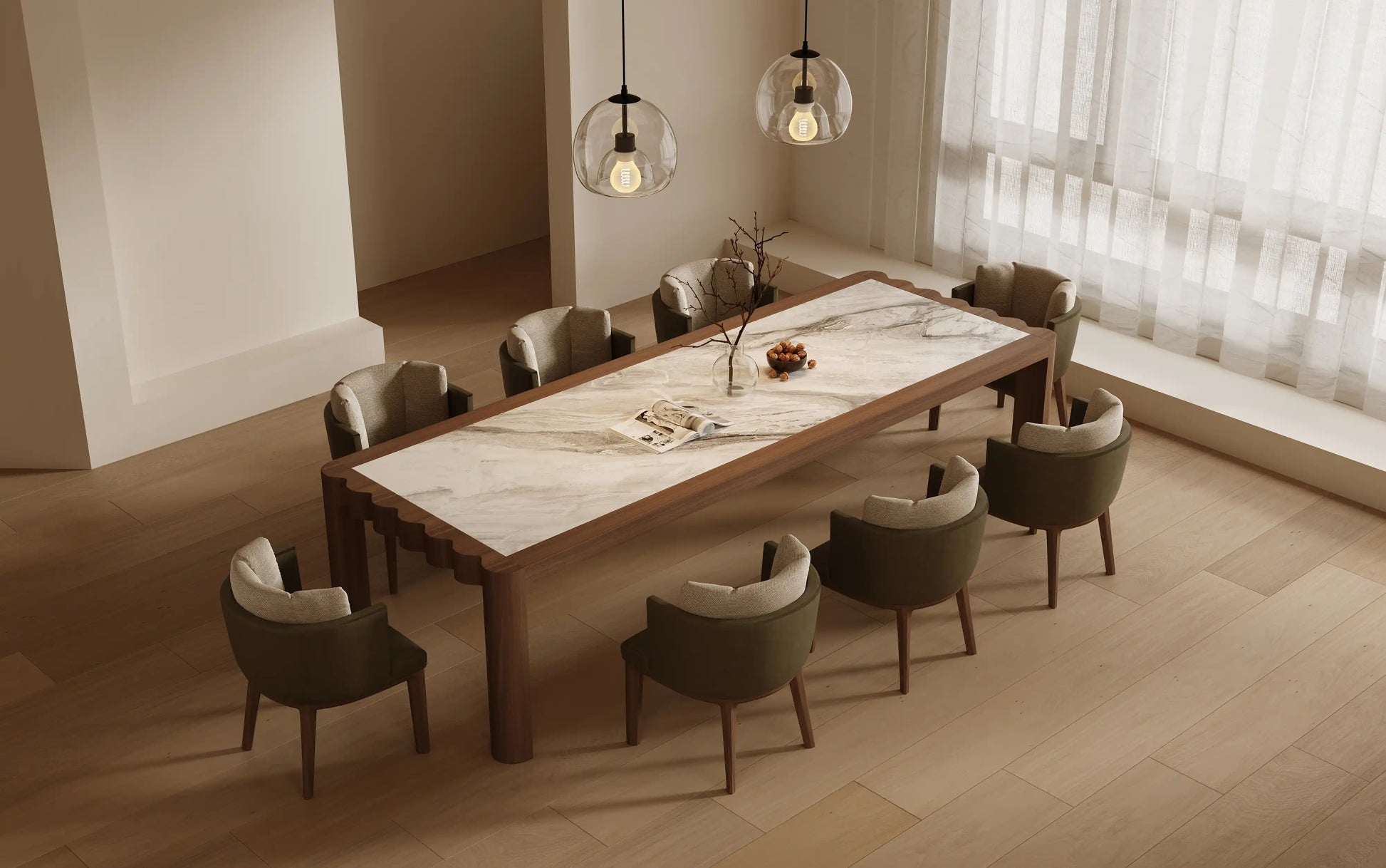 The SHAN ZHU Dining Table is an ode to restrained grandeur — where nature’s most noble elements meet in a quiet act of balance. North American Black Walnut, dark and dignified, frames a marble surface as luminous as frozen light, creating a composition that feels both grounded and ethereal.