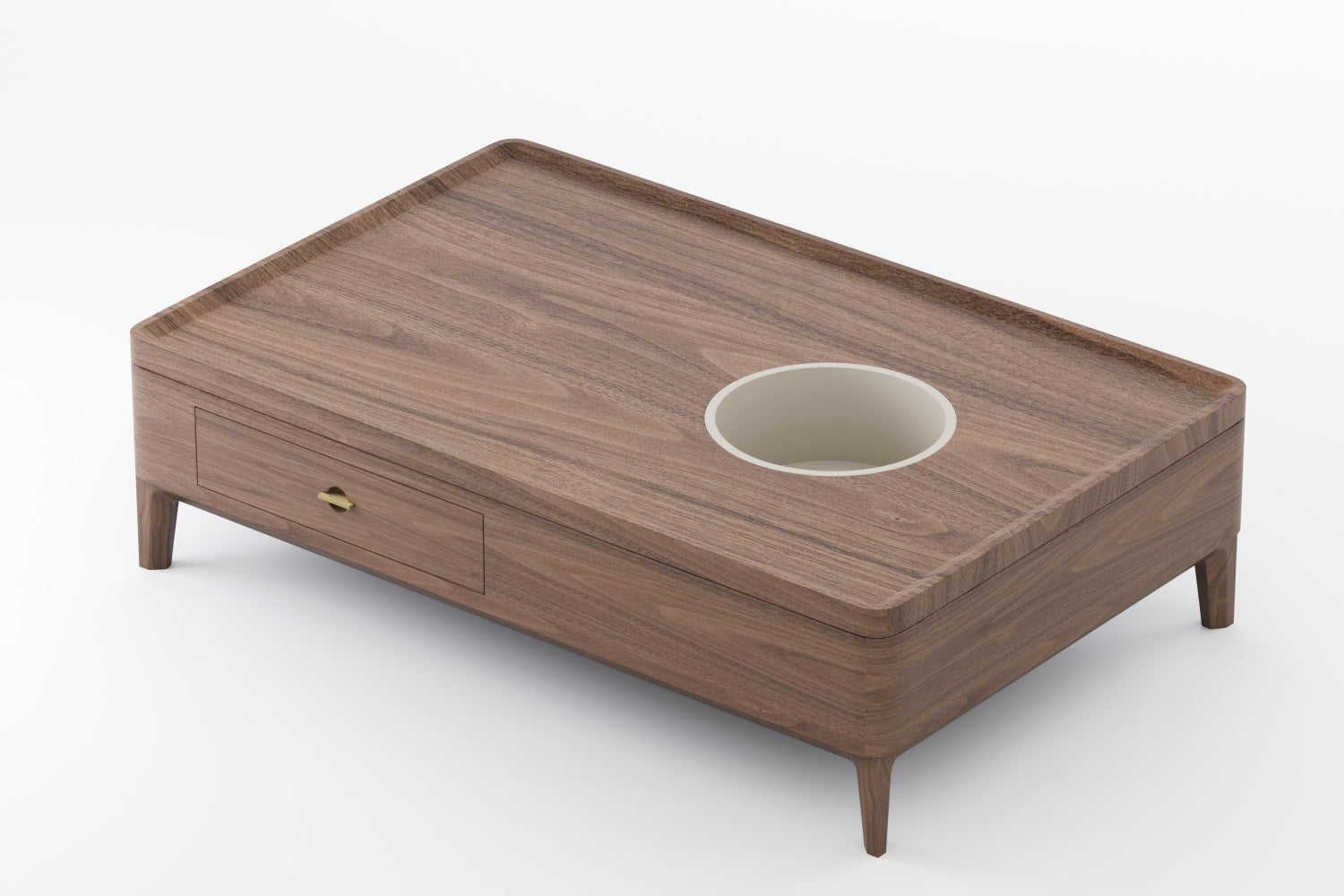 The richly grained walnut surface glows with depth and warmth, while precision-crafted metal handles and an integrated metal tray add a subtle glimmer of modern elegance. Each detail reflects a dialogue between tradition and innovation, nature and design.
