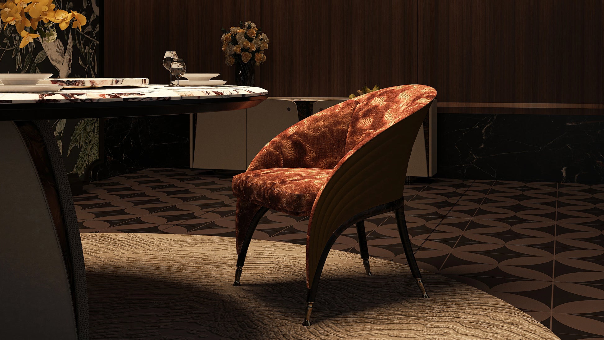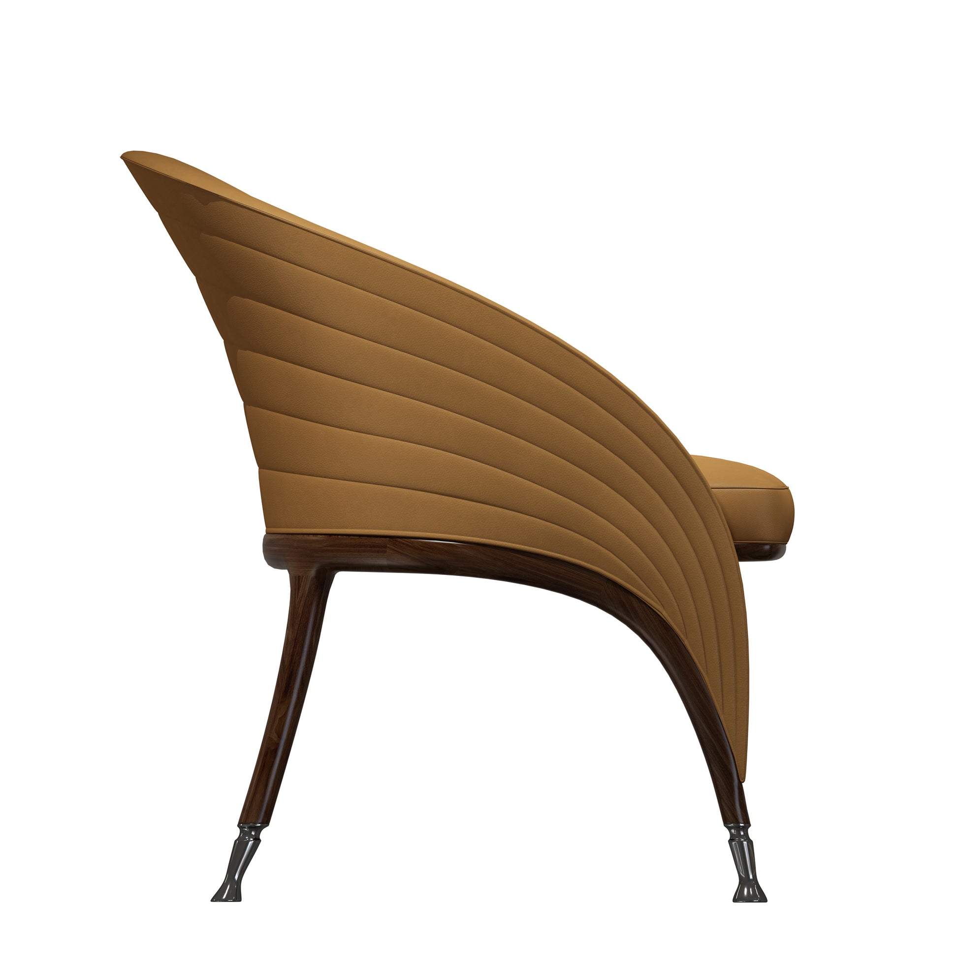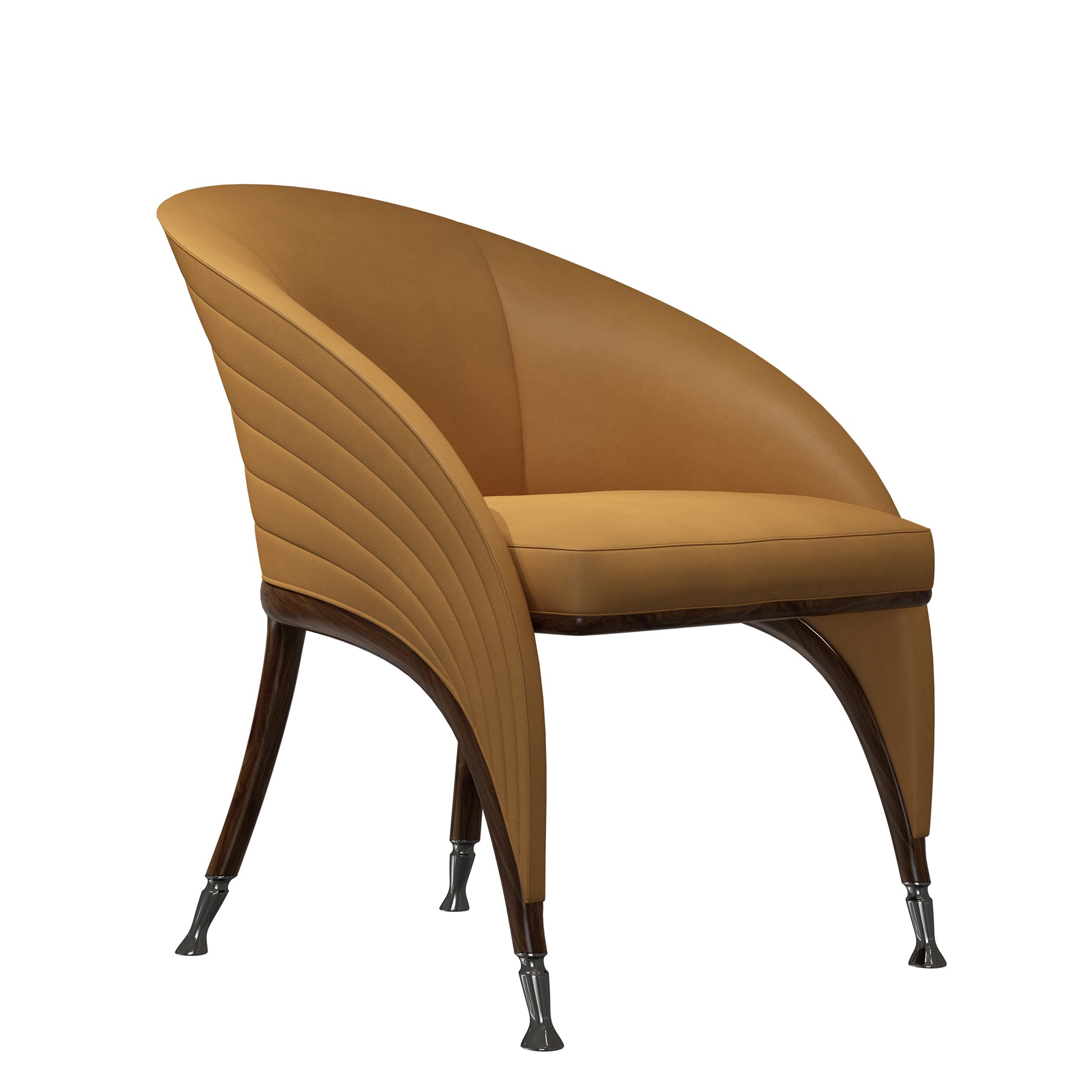 The surface reveals subtle tonal depth as light moves across it, lending the piece a warm, atmospheric presence. Balanced yet expressive, the chair integrates seamlessly into refined interiors, offering comfort through precision rather than excess.