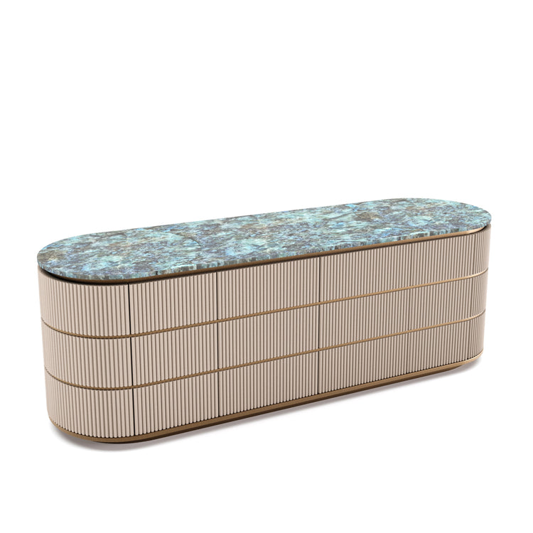 The top is adorned with the rare beauty of Norwegian Calacatta, its veins woven into a stunning mosaic of nature’s own artistry. A soft matte bronzed finish traces the metal accents, offering a gentle contrast to the stone’s bold presence. This piece serves not only as a storage solution but as a sculptural centerpiece for any luxurious setting, embodying the delicate balance between form and function.