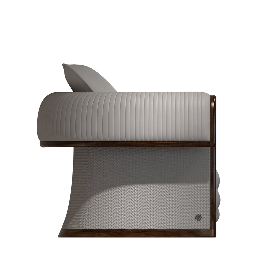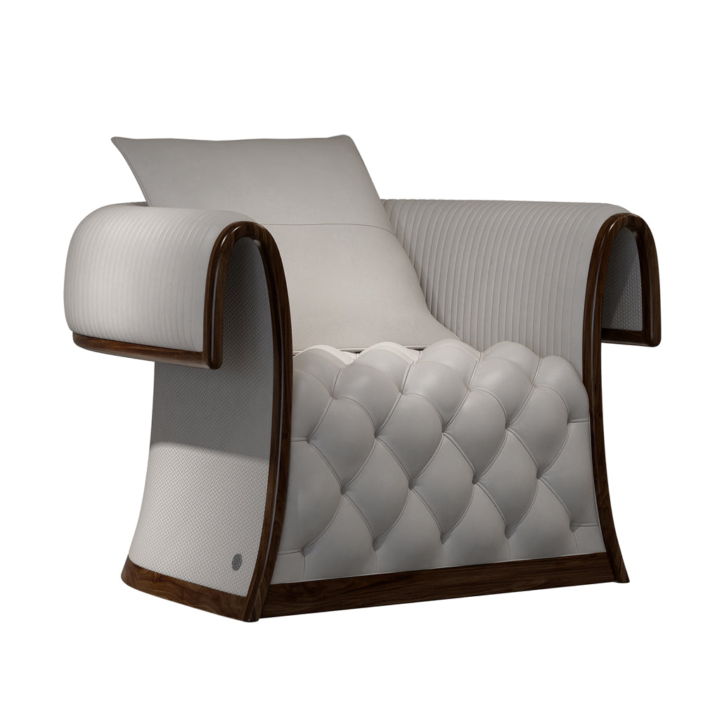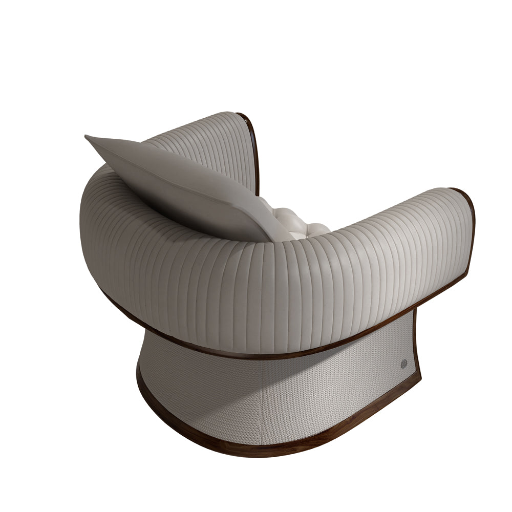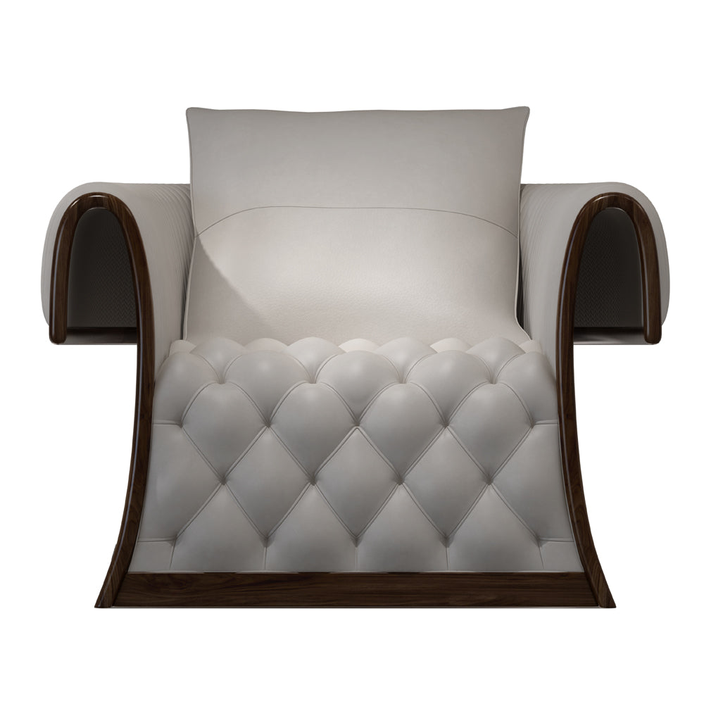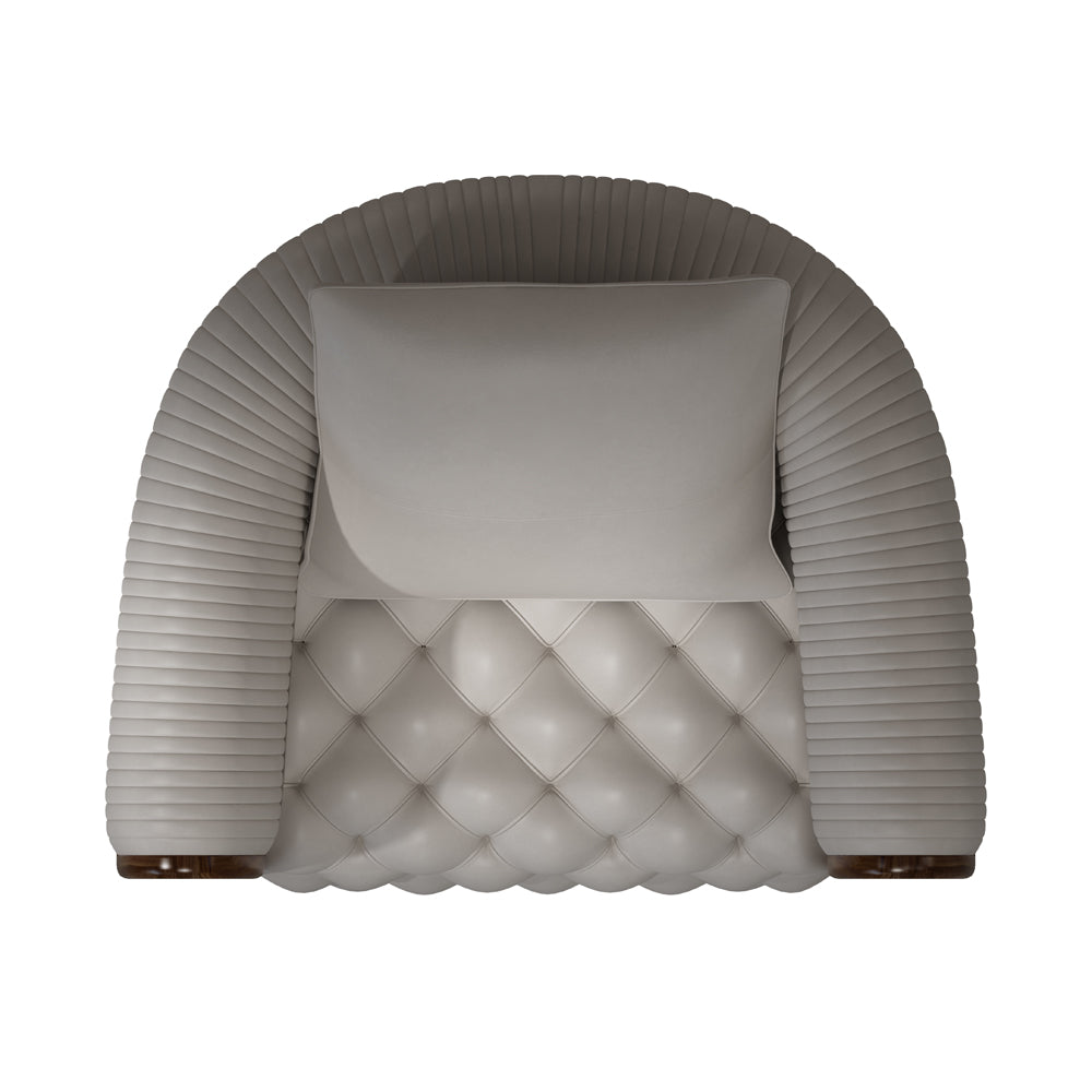 Broad, embracing armrests flow into a grounded base, creating a visual rhythm that feels ceremonial yet intimate. The chair’s posture invites repose without indulgence, offering comfort that is dignified, not declarative. Gentle quilting across the lower façade introduces a subtle cadence, echoing tailored craftsmanship once reserved for private salons and long-kept libraries.