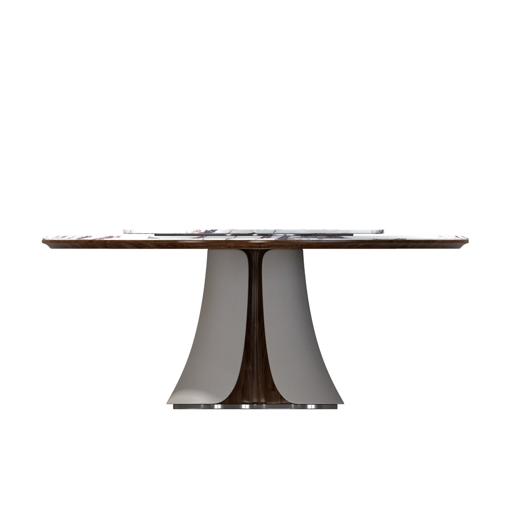 The composition balances strength with grace. A sculptural base rises with a calm authority, its form echoing classical European architecture softened by contemporary restraint. Above, the tabletop appears to float, layered with intention, offering a subtle sense of hierarchy and ritual—an elevated plane for shared moments, formal gatherings, and unspoken traditions.